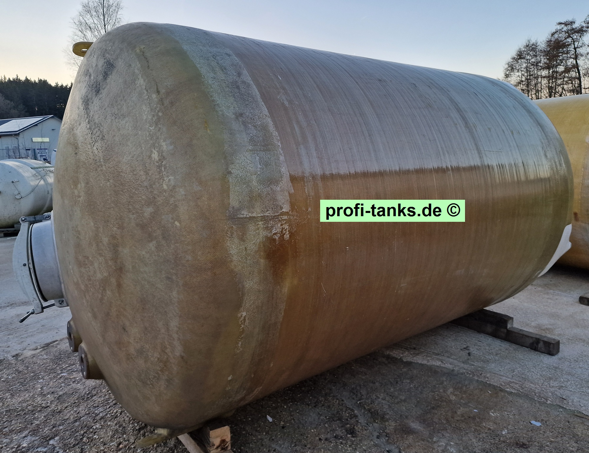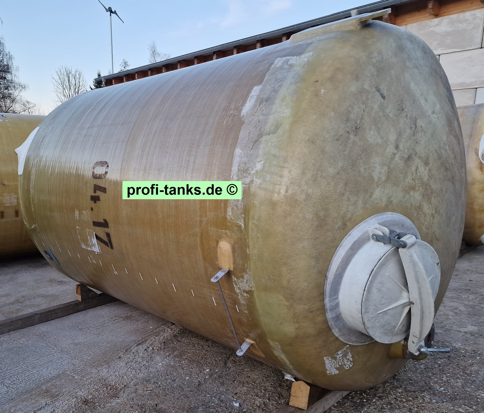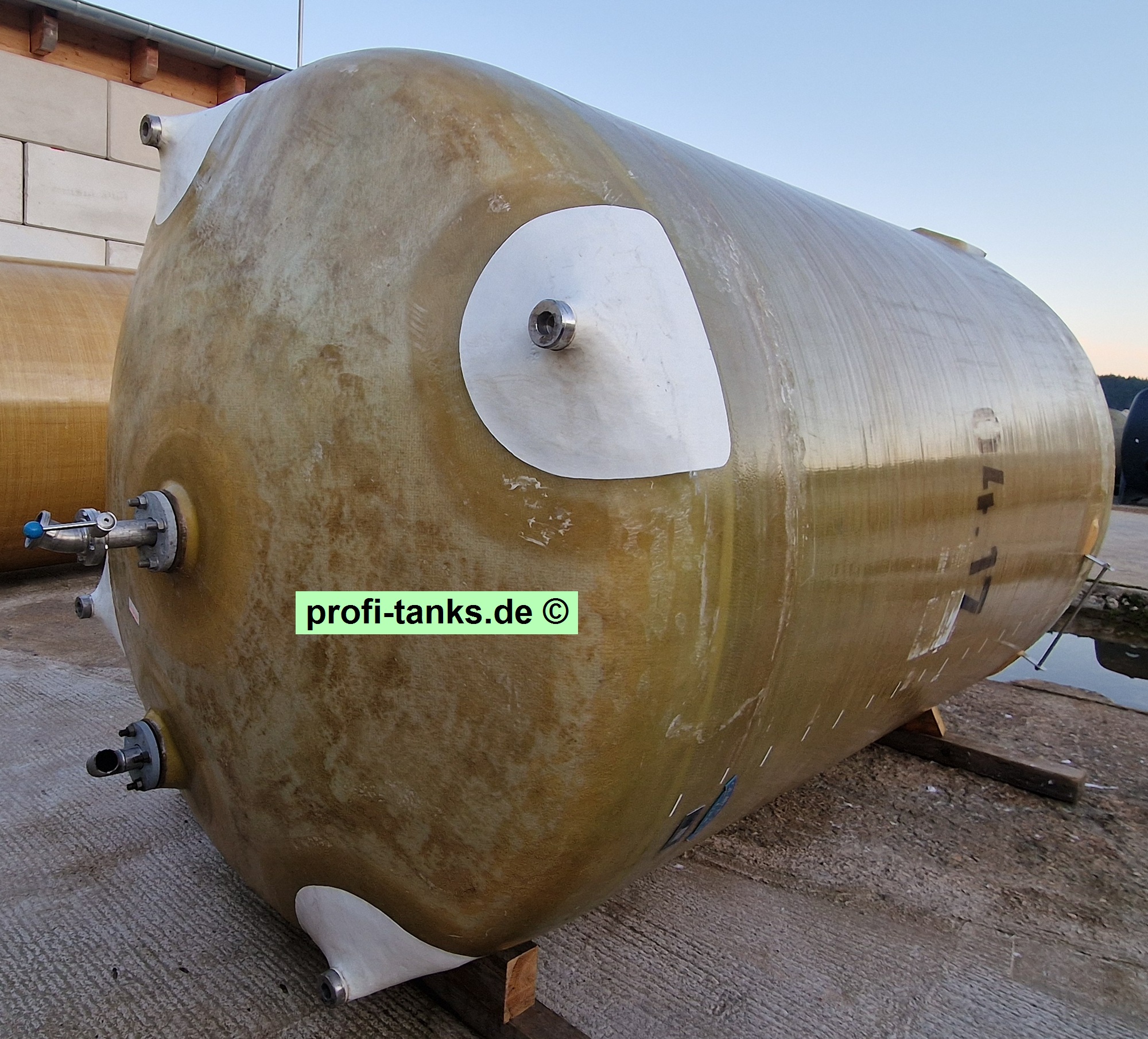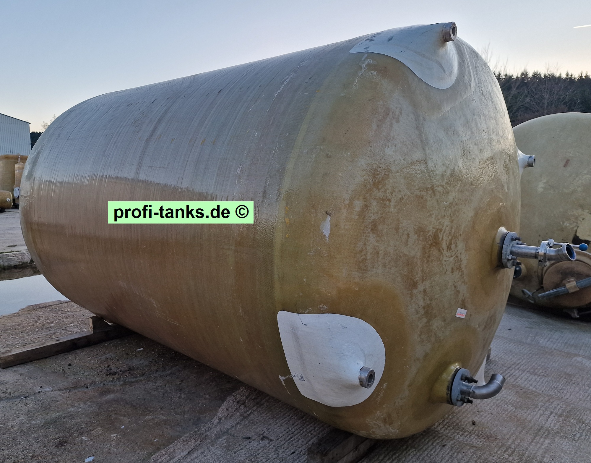 Sonstiges: Gebrauchter Polyestertank, gereinigt und in gutem Zustand. Stehender GFK-Lagertank auf Stahlgestell, runde Form, Dom oben auf dem Dach, mehrere Zu- und Ausläufe.