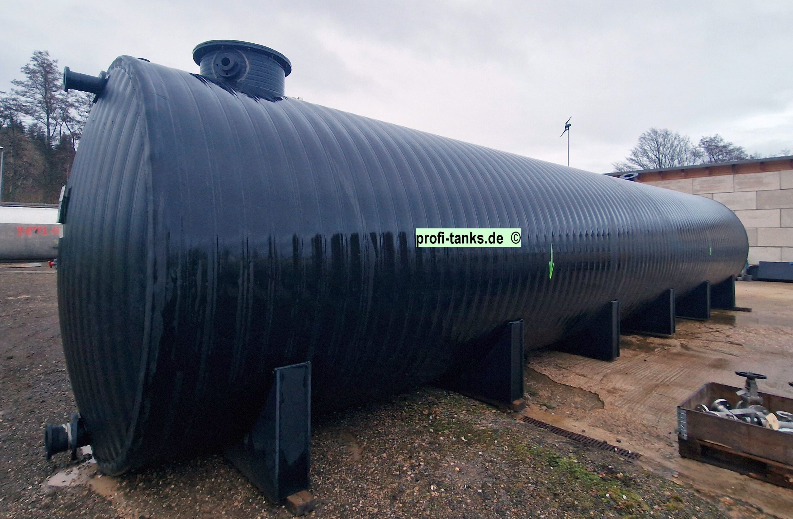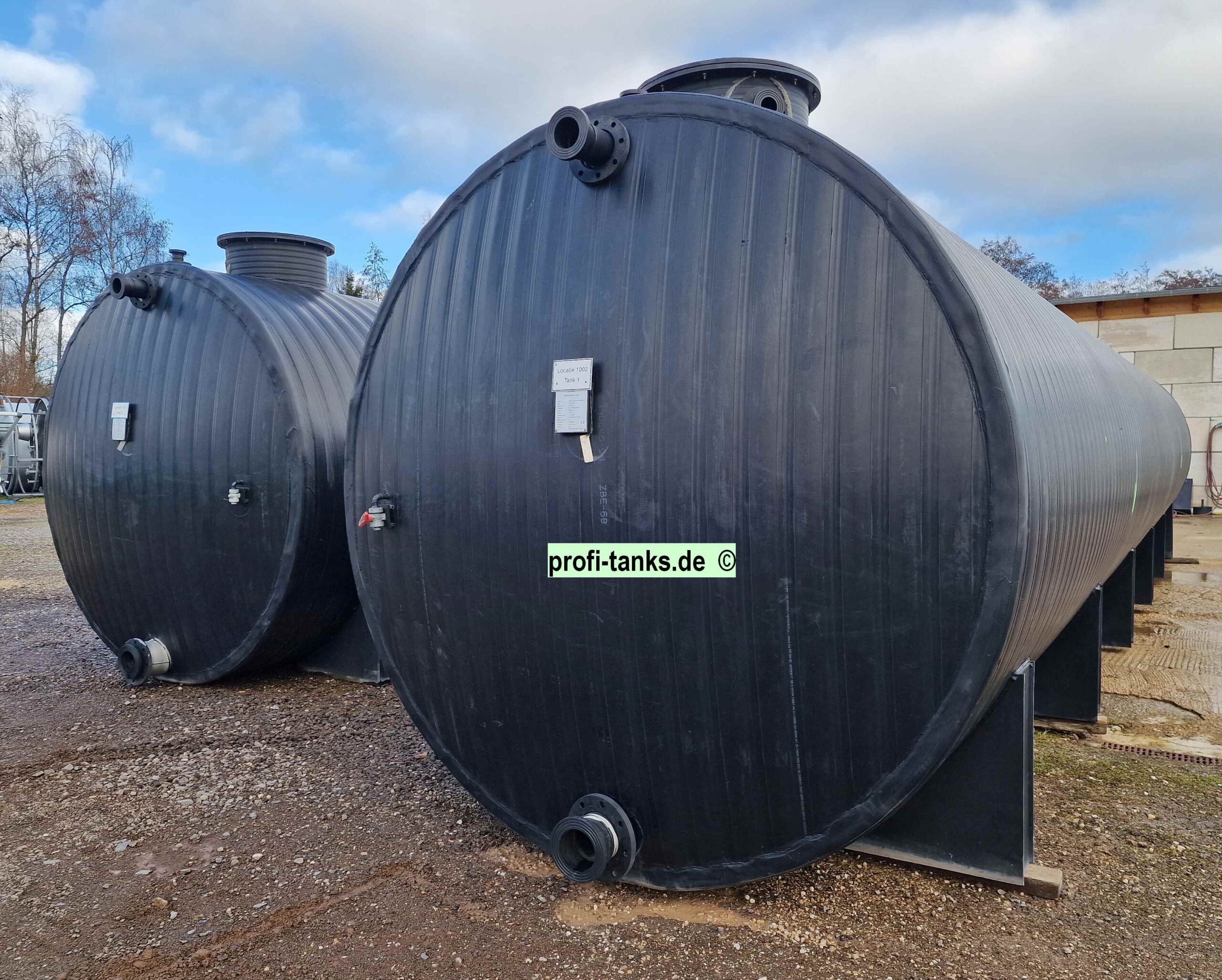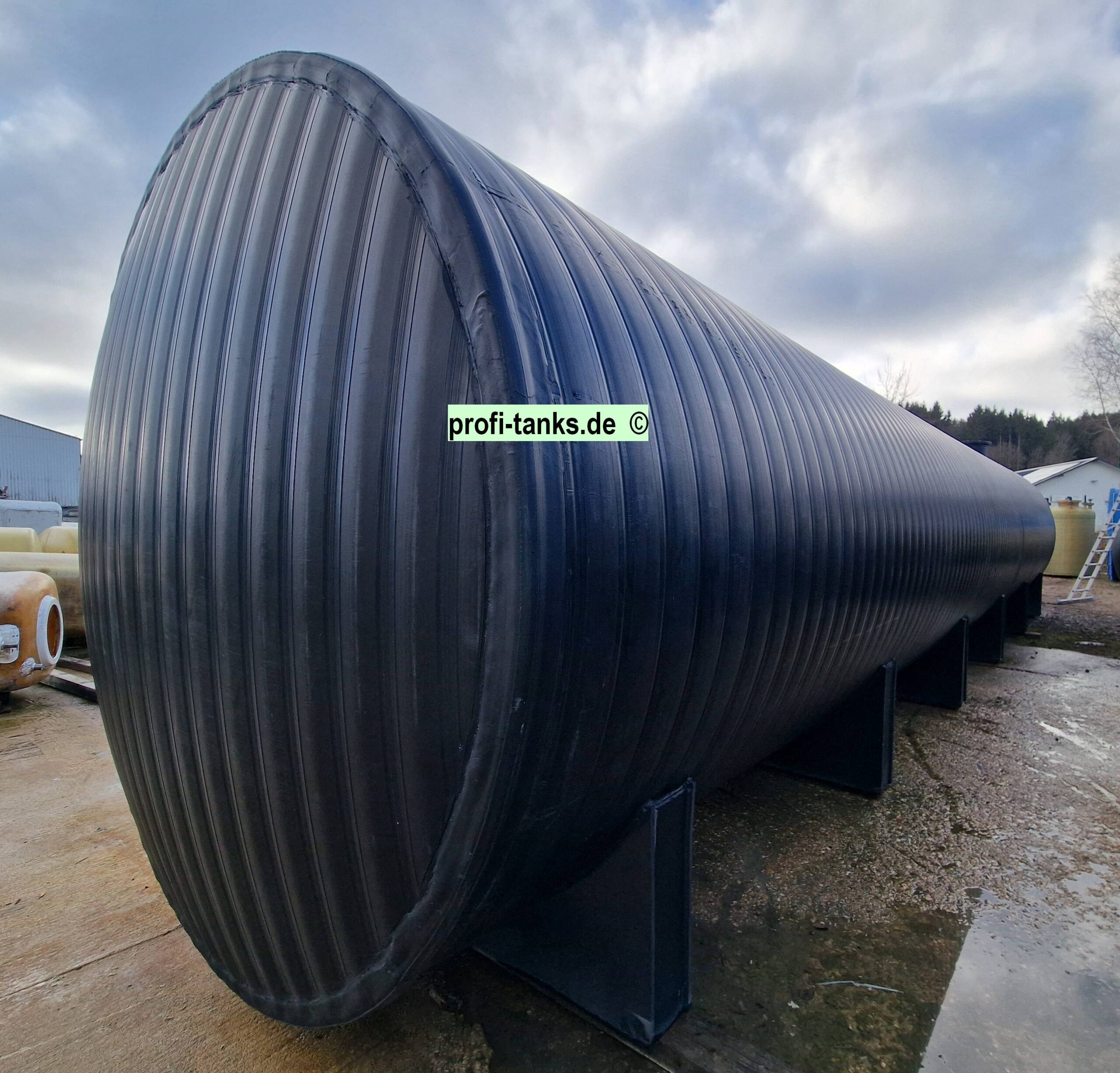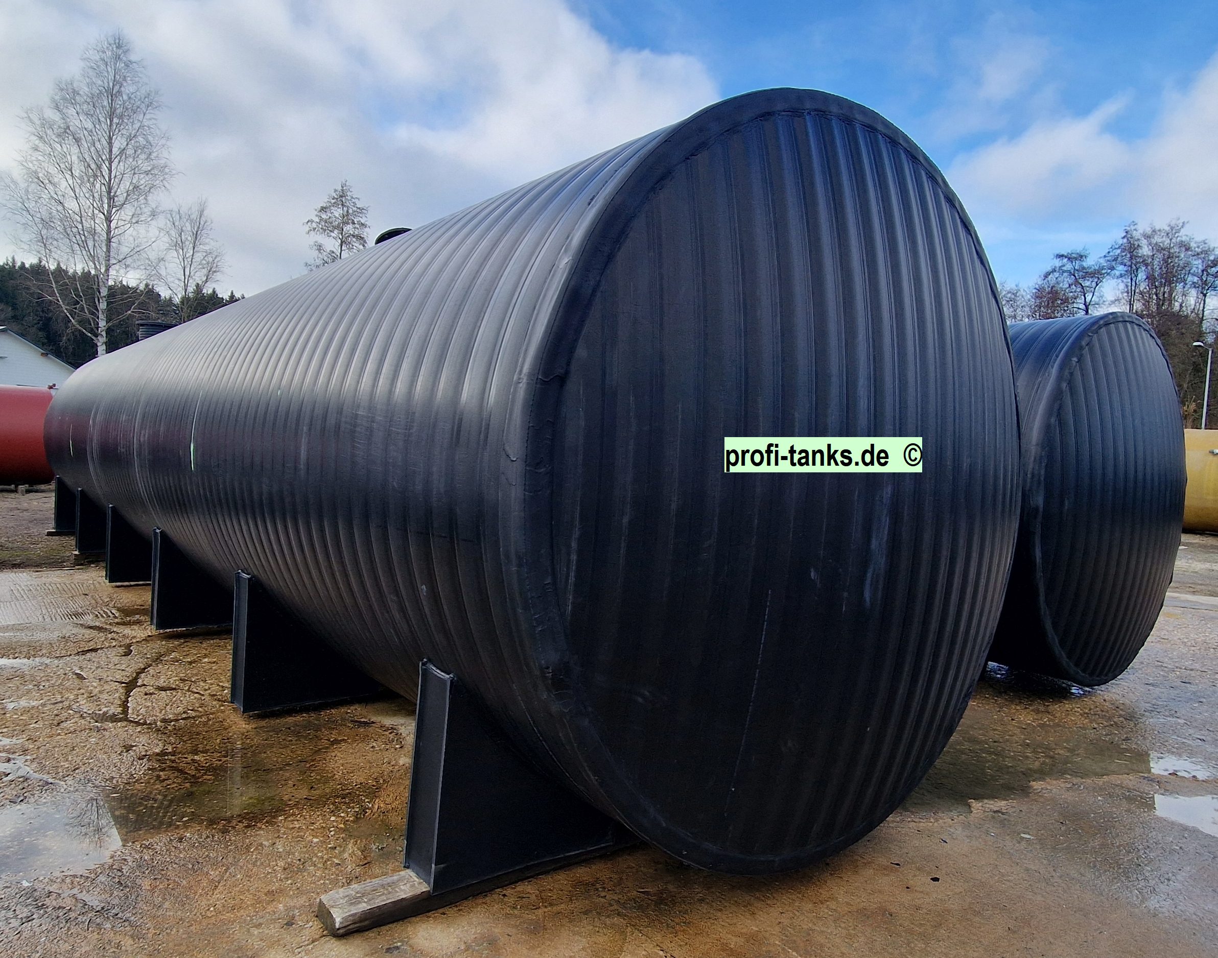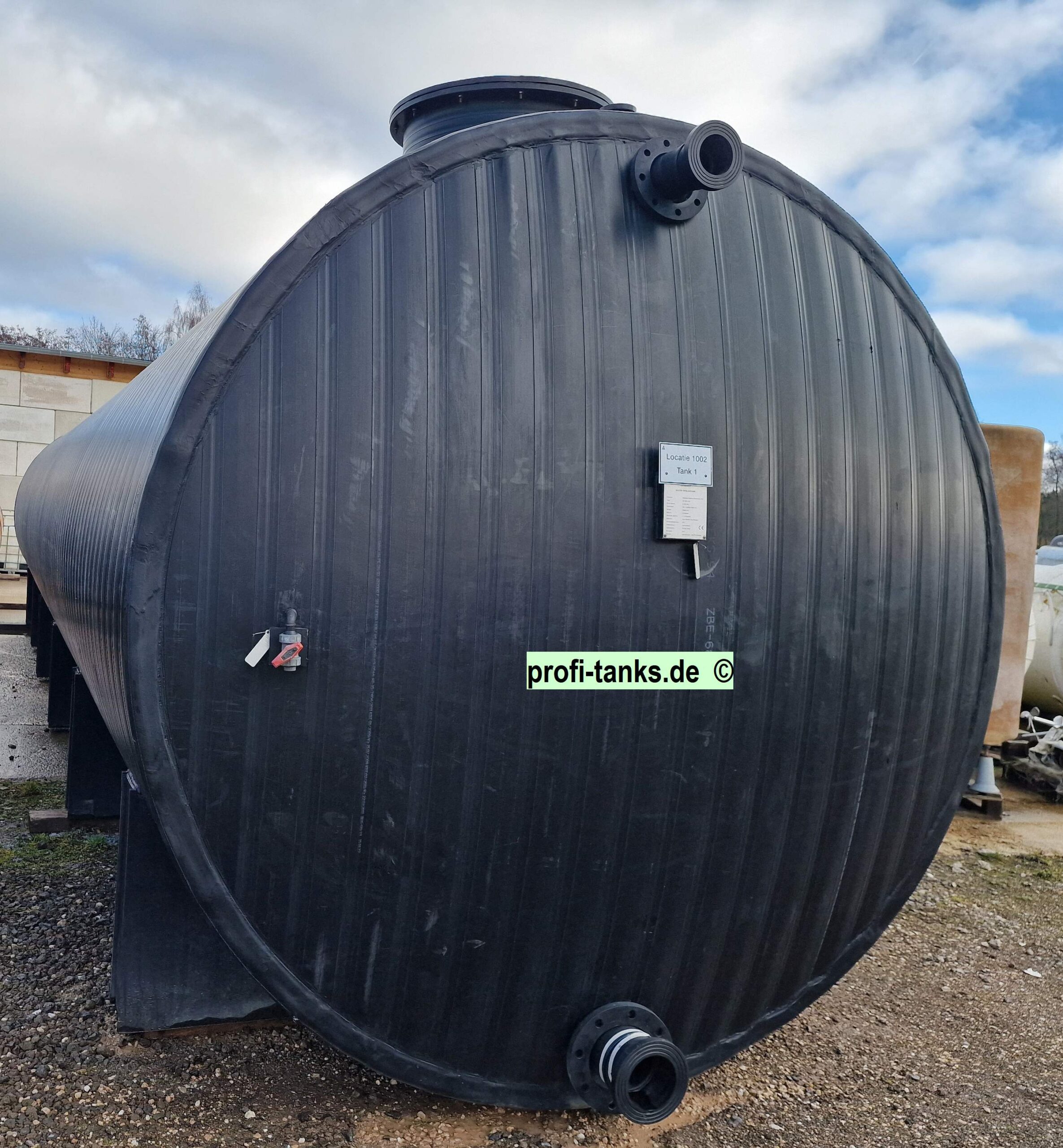 Sonstiges: Gebrauchter PEHD-Tank, gereinigt und in gutem Zustand. Liegender Kunststofftank auf 6 Sockeln, Dom auf der Oberseite, mehrere Zu- und Ausläufe. Unten und oben auf der Stirnseite ein Auslauf ca. DN100 und ganz oben auf dem Tankkörper ein Auslauf ca. DN120. Ehemaliger Wassertank.