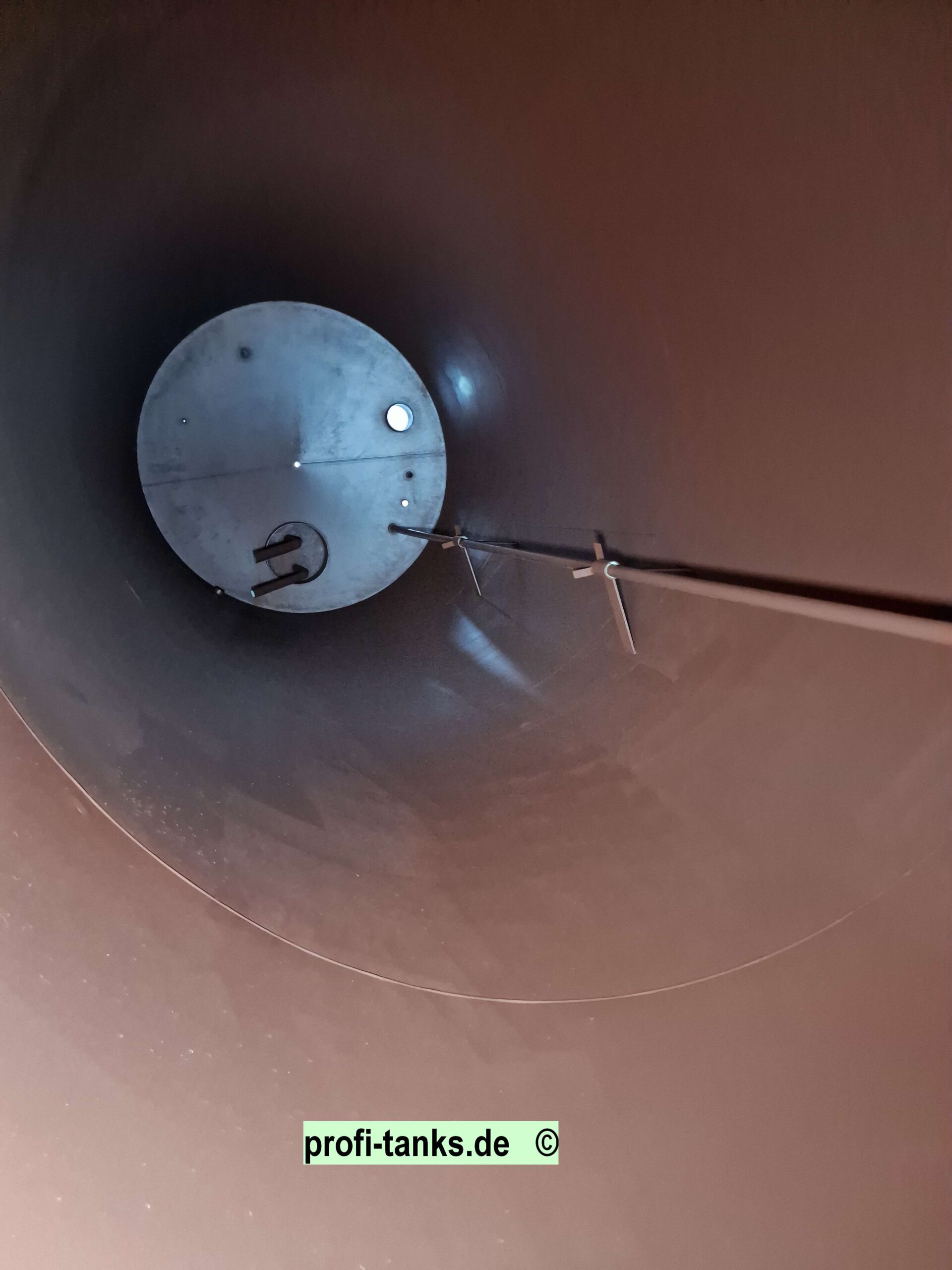 Tank von innen neu gestrichen in rotbraun (mit einer Farbe für den Innenanstrich Brantho-Korrux „3 in 1“, Rostschutzfarbe, Metallschutzfarbe, Instandhaltungsfarbe, Brantho-Korrux 3in1 darf nach den Vorschriften des Bundesgesundheitsamtes (XL) für die Innenbeschichtung von Lebensmittelbehältern und lebensmittelverarbeitenden Maschinen verwendet werden (geprüft durch Lab. Dr. Kittel 01/1989).